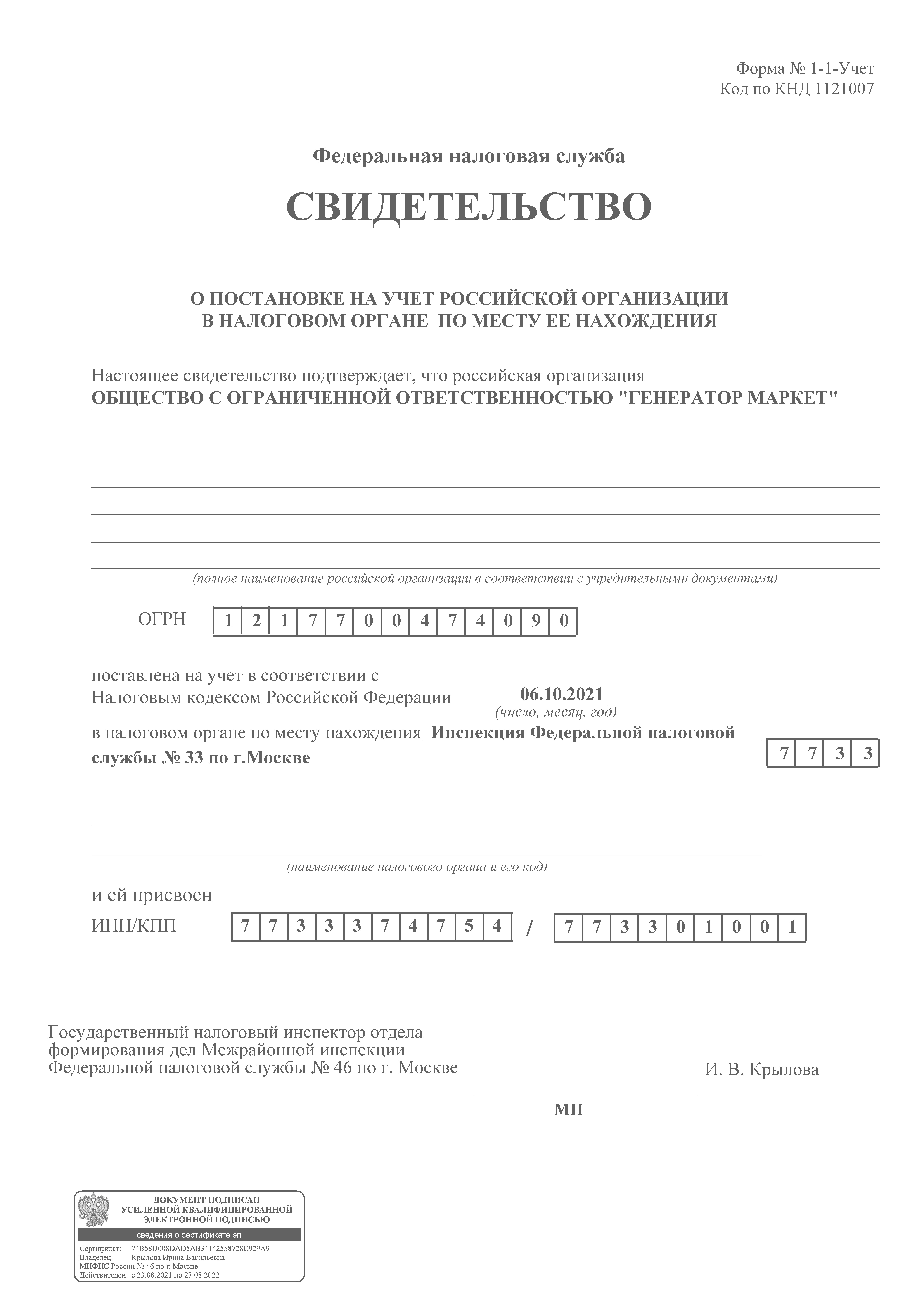 Свидетельство о государственной регистрации юридического лица и Сертификаты полномочий ведущих дистрибьюторов генераторных установок на территории Российской Федерации - гарантии надежности и профессионализма команды "Генератор Маркет".